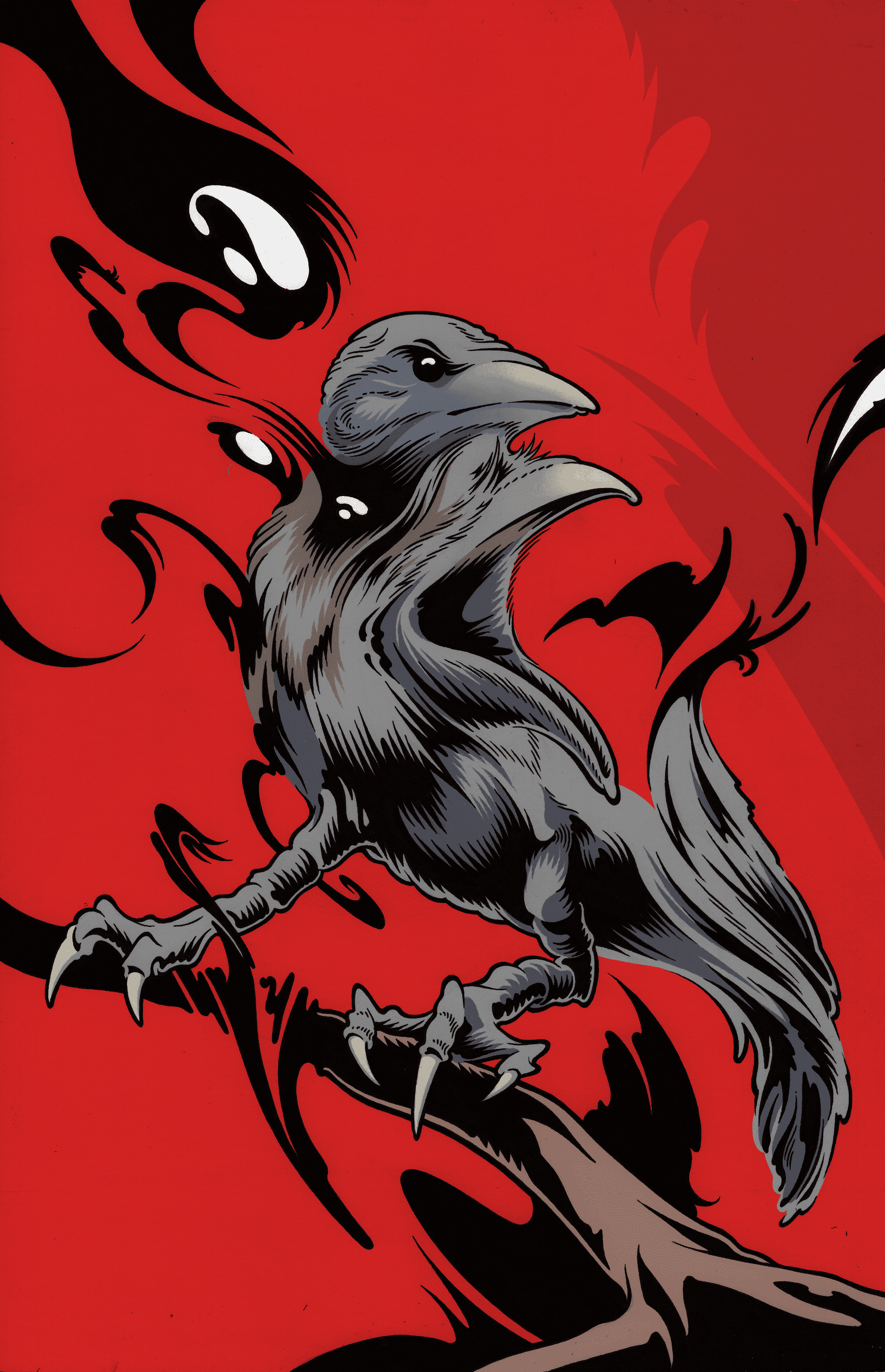 And there it was. Just like Ding described. A large, thick billed, black bird. Red eyes. Social creatures, crows typically live and hunt in structured families. They are known for their exceptional intelligence, with some species capable of basic tool use, using sticks to pry food out of holes. As omnivores, they are known to kill and eat small animals. Examples of inter-species relationships between crows and humans have been historically documented. At times, crows have traded with humans, exchanging pebbles and small objects for food. There have also been cases of known “grudges,” a crow repeatedly attacking the same human over the course of months or even years. Crows typically live to thirteen years old.